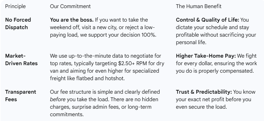 At MBM Dispatching, we don’t just offer a service; we offer a partnership. We were founded on the belief that dispatching should be straightforward, flexible, and entirely focused on the driver’s success. We know that every driver has a life, a family, and a preferred schedule, and we operate accordingly.